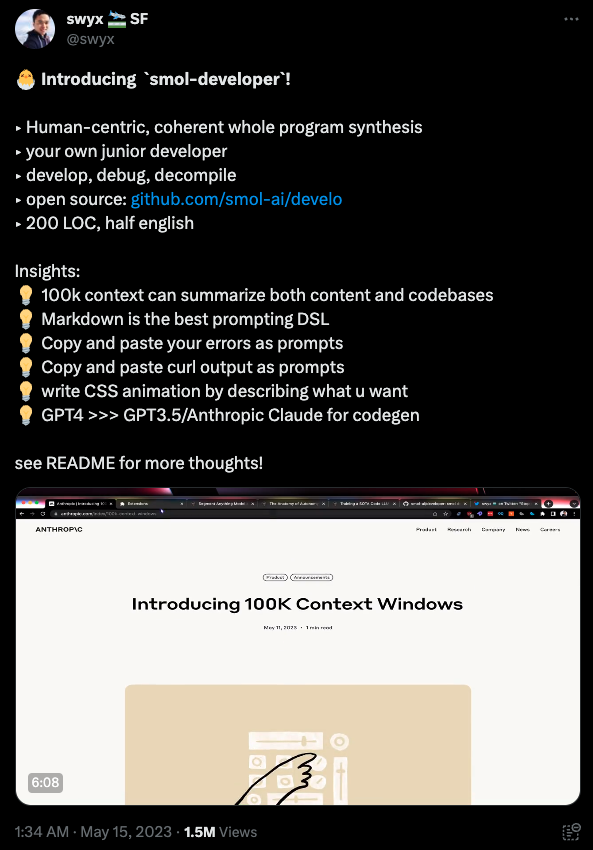 Smol AI (described as a platform for “model distillation and AI developer agents”) actually has a few open-source tools on offer, but Smol-Developer is the one we’ll be taking a look at. It was initially released by Swyx on May 11th and already has over 10k GitHub stars!